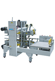 纸箱经前段封箱机中间上下封口后,进入90度转角机构,由推箱板进入角边封箱机封箱机构,纸箱上下四个角边同时自动封口,抚平;封箱美观,快速,节省人力,效率高;